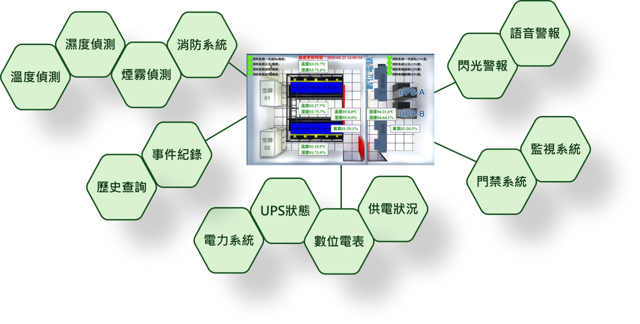 將機房內的多個環控系統整合在一起,這些系統包括溫度、濕度、空氣流通、電力供應、消防安全基礎設施等。
